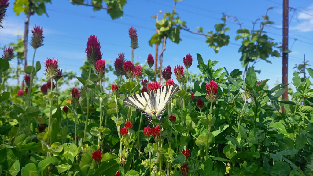 Den Boden zwischen den Rebzeilen brechen wir nicht um. Verschiedene Begrünungspflanzen sorgen unter der Erde für ein reges Bodenleben und ziehen mit ihren Blüten nützliche Insekten an. Eingesäte Kleearten und Kräuter wachsen dort ebenso, wie die natürliche Pflanzenvielfalt. Besonders stolz sind wir auf den seltenen Grünen Milchstern und die Traubenhyazinthe. Für wunderschöne bunte Farbtupfer in der Landschaft sorgen auch die Mandel- und Kirschbäume, die nicht nur den Bienen Nahrung liefern.